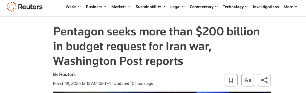 Pentagon práve požiadal Biely dom, aby predložil Kongresu schválenie dodatočného rozpočtu vo výške 200 miliárd dolárov.