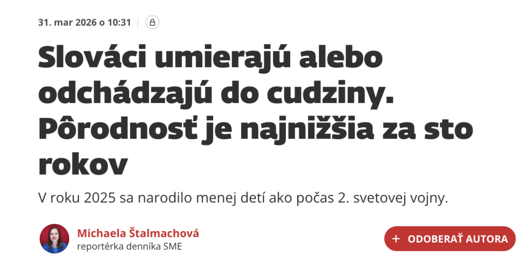 Proces od počatia do donosenia dieťaťa trvá nejaký čas. Dáta o stave živonarodených detí v SR majú istú krivku, ktorá zmenila tendenciu na výrazný pokles v rokoch, kedy vládla iná vláda (2022-23). Korelácie počítať vieme. A vieme určiť, čo sa v danom čase dialo inak ako kedykoľvek predtým. Ľudia na Slovensku sa majú ekonomicky ešte stále dobre s negatívnym výhľadom, ktorý však vnímajú maximálne iba za posledné dva roky. Tí, čo po voľbách verejne vyhlasovali, že nechcú ostať a chcú vehementne odísť, včera obchádzali dlažobné kocky na námestí SNP. Iba vymenili vlajky. Pribudla Antifa a Palestína. Taký malý “No kings” s rovnakým sponzorom.